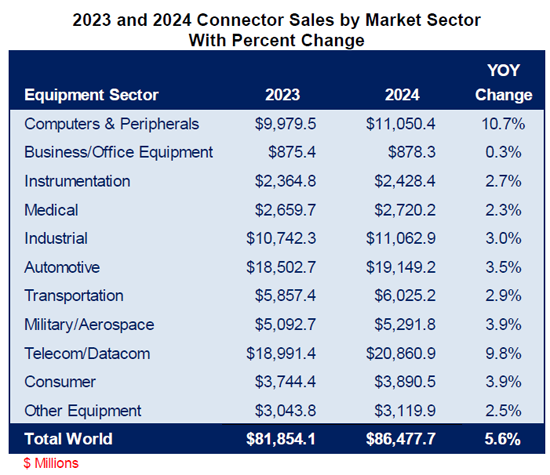 - 2023 and 2024 Connector Sales by Market Sector with Percent Change