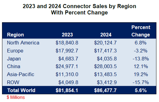 - 2023 and 2024 Connector Sales by Region with Percent Change