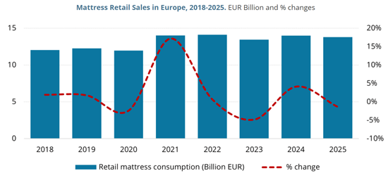 The European mattress market remains one of the largest worldwide, accounting for around 15% of global consumption. At retail prices, the market is estimated at nearly EUR 14 billion, now above pre-pandemic levels. Against a backdrop of persistent uncertainty, Europe is expected to remain a strategically important region in the medium term, both as a large and relatively stable market and as a key destination for diversified export flows, attracting interest from both European manufacturers and foreign players seeking to rebalance their international sales exposure.
