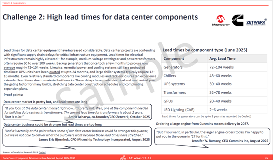 • 趋势与挑战: 我们探讨了关键趋势,例如高密度机架向液冷技术的转变、废热回收和模组化。我们也详细介绍了关键挑战,例如电网容量限制和零件交付时间过长。