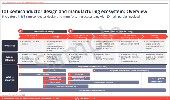 • 物联网半导体价值链概览: 描绘了设计和製造生态系统中的六个关键步骤和十个主要利害关係人群体。探讨了四大关键技术趋势,包括依区隔市场和地区划分的市场支出。