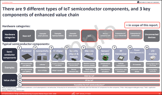 • 148页报告: 全面分析物联网半导体价值链,重点在于关于设计、IP 和製造生态系统。