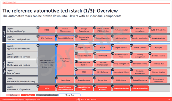 - The SDV software stack: Dissects the reference automotive tech stack into 8 layers, including the hardware & E/E platform, middleware, and application layers. It evaluates key frameworks such as AUTOSAR Adaptive and Eclipse SDV, and deep-dives into vehicle platforms like MB.OS and Tesla OS.