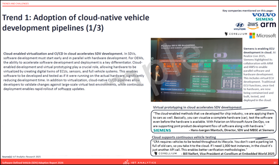 - Trends and challenges: Identifies macro trends such as the adoption of cloud-native development pipelines and the modularization of software stacks. It also addresses challenges like consumer pushback on subscription models and the shortage of software engineering talent.