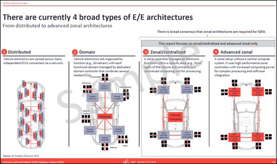 - Vehicle architectures: Details the transition from domain-based to zonal E/E architectures. The section analyzes the benefits of zonal designs, such as weight reduction and simplified wiring, while addressing barriers like skill gaps and high upfront costs.