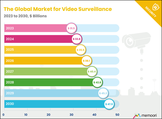 - Total global revenues for video surveillance equipment and software at factory gate prices reached $33.8 billion in 2024, with projections of $35.5 billion in 2025 and growth to $47.9 billion by 2030. This represents a compound annual growth rate of nearly 6%, reflecting the sector's transition from reactive security deployments to strategic, intelligence-driven infrastructure investments.