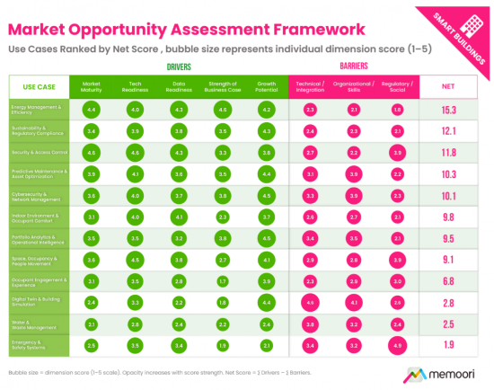 每个领域均使用以下8维评估框架进行评估,该框架包含五个积极的市场驱动因素(市场成熟度、技术准备度、资料准备度、商业案例强度和成长潜力)和三个障碍类别(技术/整合、组织/技能和监管/社会障碍)。
