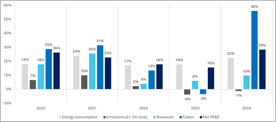 本报告分析了全球20家领先的超大规模公司,并列出了财务指标(收入、资本支出、净固定资产及设备)和能源相关指标(能源和电力总消耗量、可再生能源占比和温室气体排放量)。数据涵盖2019年至2024年,分析采用了突显能源使用和永续发展趋势的衍生指标。