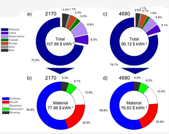 (b)(d) Detailed material cost analysis of 2170 cells vs. 4680 cells. This donut chart breaks down material costs into anode, cathode, separator, electrolyte, and housing. It clearly shows that cathode and anode materials are the main cost drivers.