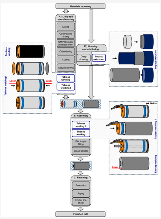 - Center: Cell assembly (B) - the jelly roll is inserted into the housing and assembled through various welding processes. Laser and ultrasonic welding are indicated.