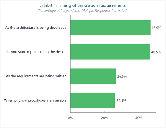 - Engineering organizations begin simulation verification and validation requirements early in the product lifecycle during architecture development and nearly the same proportion at design implementation.