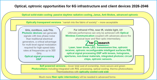 6G promises the widely available performance improved by magnitudes that can lead to radically new client devices and business propositions. For this, it must add Optical Wireless Communications OWC, Optical Signal Processing OSP, photovoltaics for self-powering, Passive Daylight Radiative Cooling PDRC, extra, improved fiber optics intermediary and more. Much infrastructure will need to become optically transparent to, "vanish into the fabric of society" - acceptable in far more places.