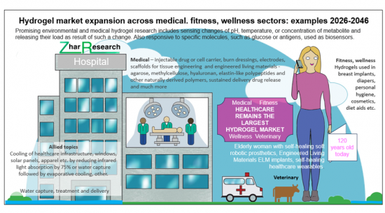 CAPTION: Hydrogel market expansion across medical, fitness and wellness sectors: examples 2026-2046. Source: Zhar Research report, "Medical and Allied Hydrogels: Markets, Technologies 2026-2046".